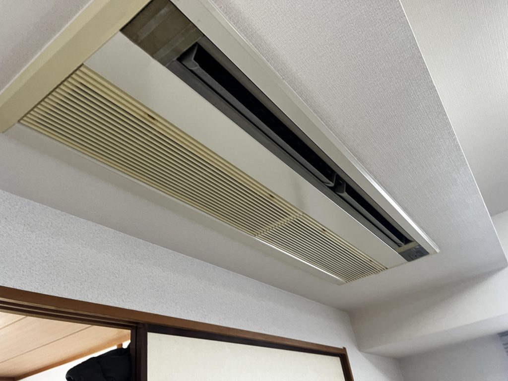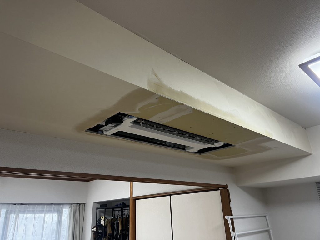 「古い天井埋込型を新しいサイズへ入れ替えたいけど、開口が大きくて隠れない…」——そんなケース、実はよくあります。今回は京都市のマンションで、家庭用ハウジングエアコン(1方向吹き)の入替工事に加え、ボード補修とクロス貼りまで当社でまとめて施工しました。