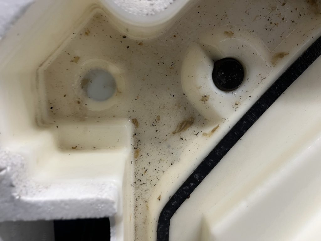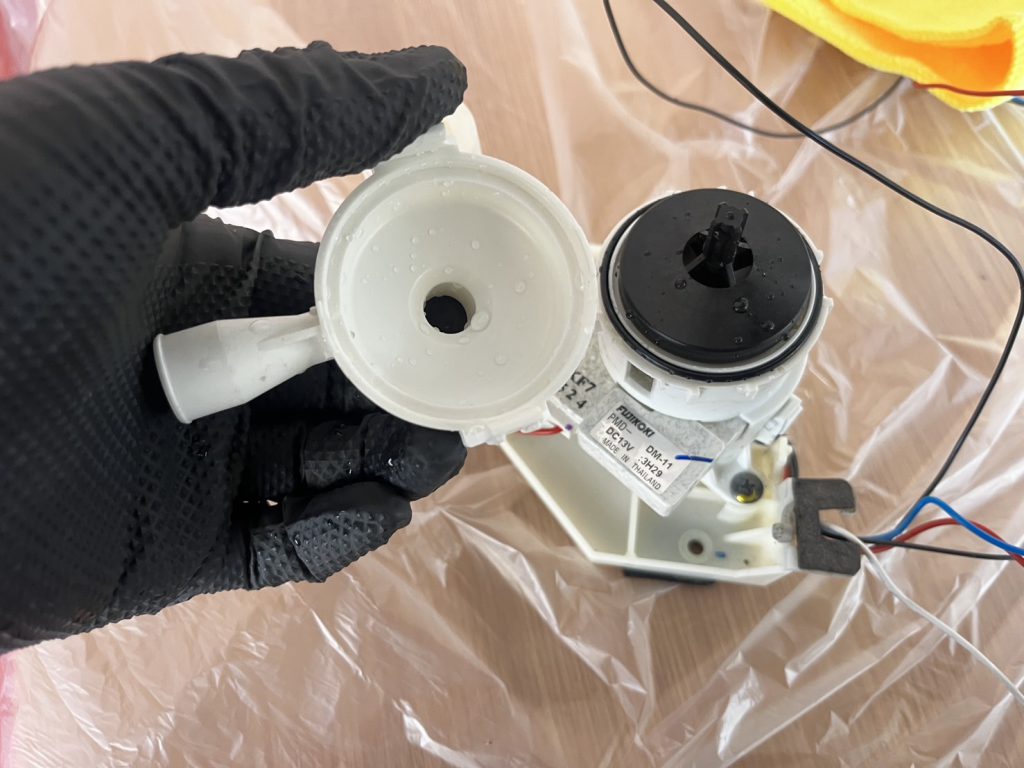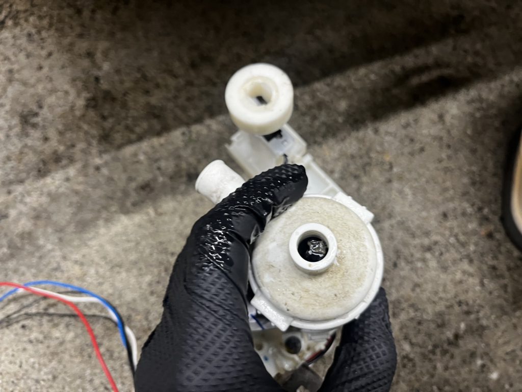 ▲ ドレンパン。スライム状の汚れが若干あります。 ▲ ドレンポンプのインペラ部にも汚れが詰まり、吐出能力が低下。 ▲ ドレンポンプ分解洗浄後。内部を綺麗にし本来の力を出せるように。 ▲ バキュームで配管内の汚れを除去。今回はこれが一番の原因でしょう。排水テストでスムーズに流れることを確認。