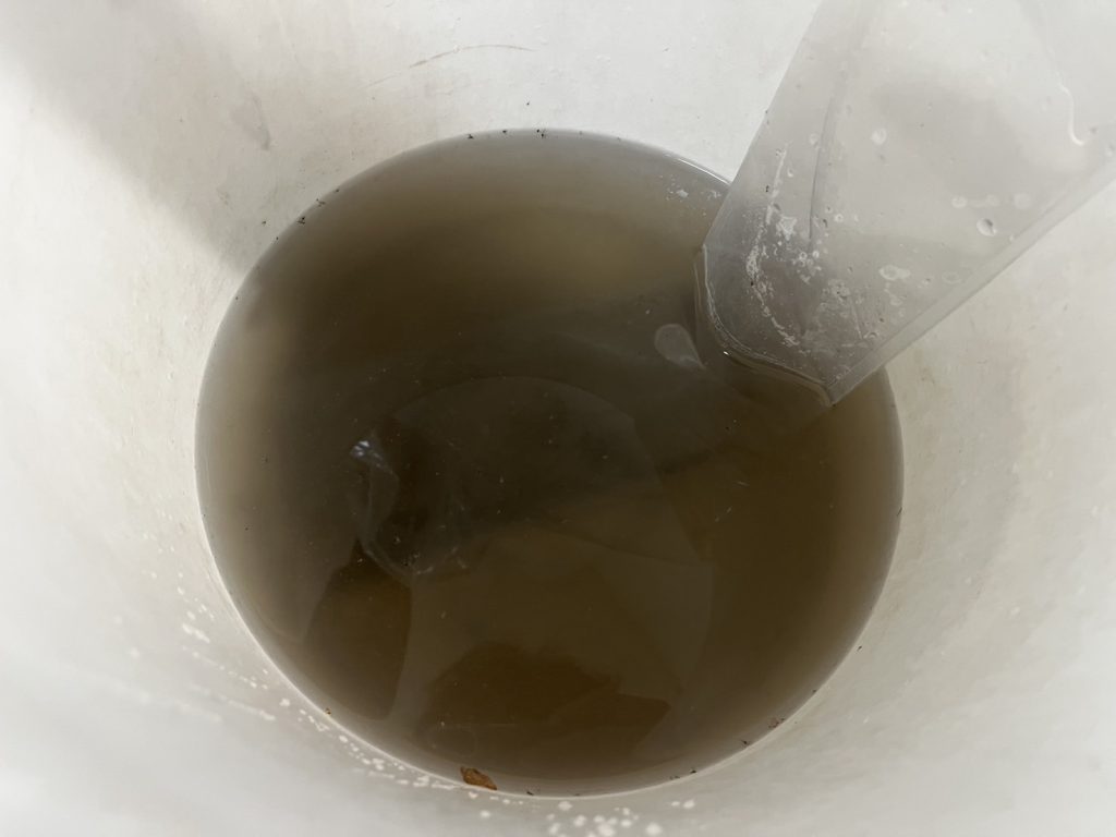 ▲ 分解して基板・配線を保護し、熱交換器とファンを露出。ここから養生して洗浄します。 ▲ 回収した汚水の一部。見た目はきれいでも内部にはホコリ・カビが蓄積しています。
