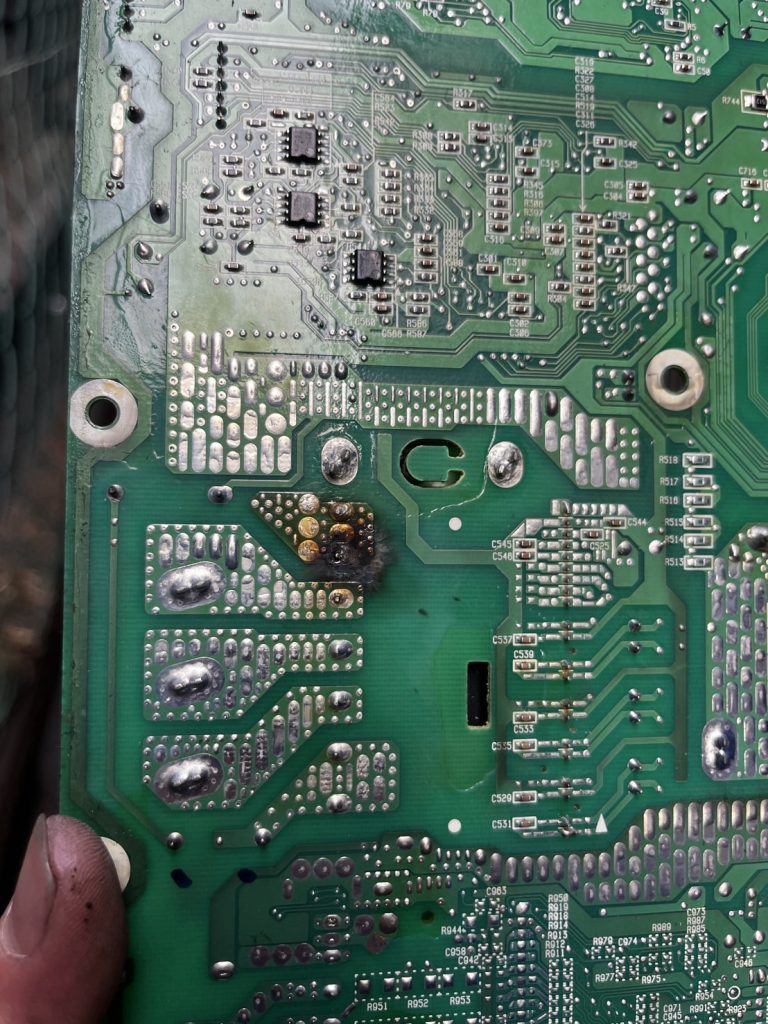- 分解点検:基板を取り外して裏面を確認すると、焼損箇所を発見。
