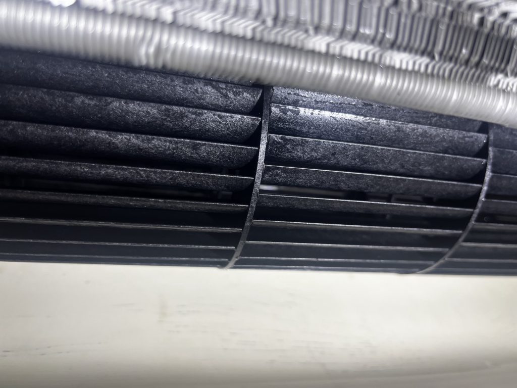 - 熱交換器(アルミフィン)にも細かな埃が詰まり、熱交換効率が低下
