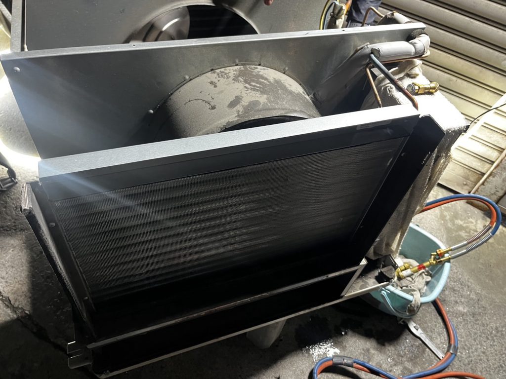 【施工事例】超古参のスポットエアコンを延命!熱交換器のガス漏れ修理とサービスポート新設