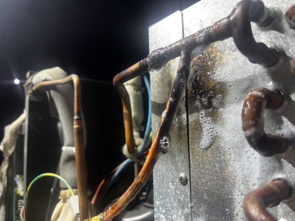 取り付けたサービスポートや交換した熱交換器の溶接箇所を窒素ガスと発泡検査で目視確認。