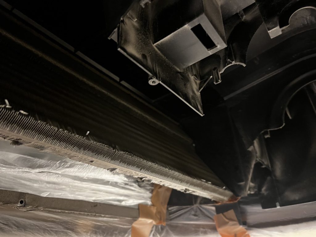 点検の結果、天井内に設置されたビルトインタイプの熱交換器や送風部に汚れが蓄積しており、風の通り道が塞がっていました。