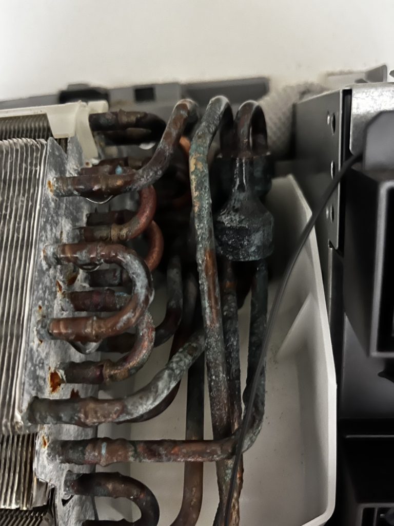 熱交換器の腐食は、結露や外気の湿気・タバコのヤニ・台所の油分などが原因で進行します。