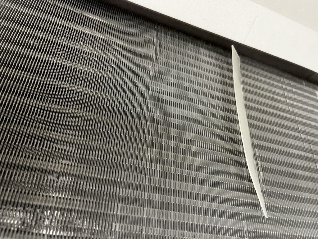 - 熱交換器(アルミフィン)の目に、ホコリとヤニのような汚れがびっしり付着