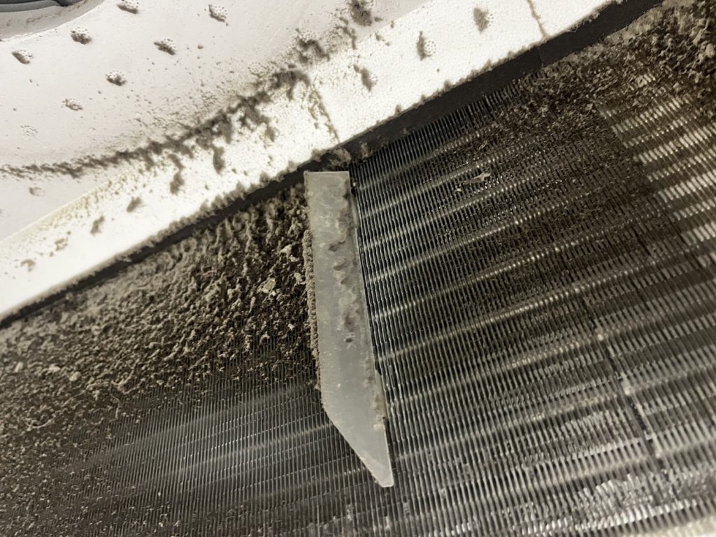 とくに熱交換器の上部には、写真のようにモコモコとホコリが積もっている部分もありました。これでは風量も冷暖房効率も落ちてしまいます。