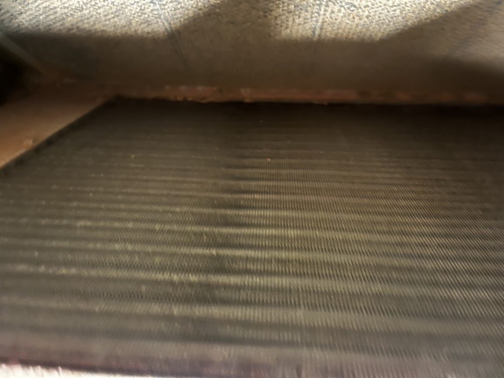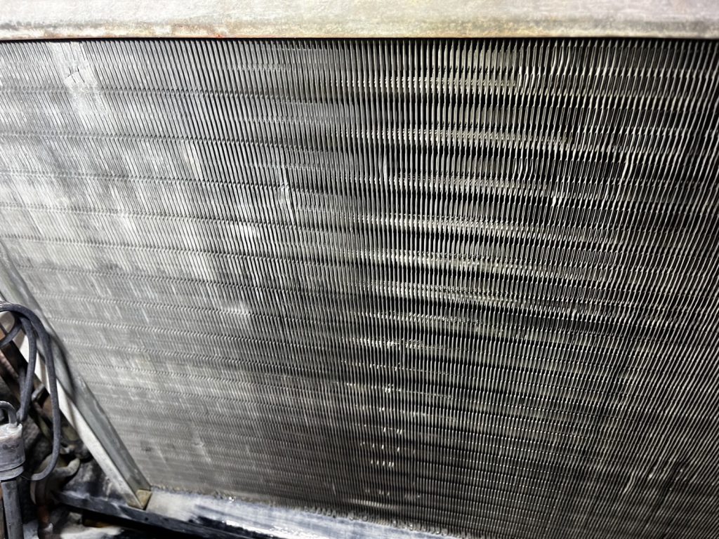 一見すると「熱交換器(フィン)がうっすら汚れているだけ」に見えても、内部(奥側)にホコリや汚れが詰まっているケースは多いです。