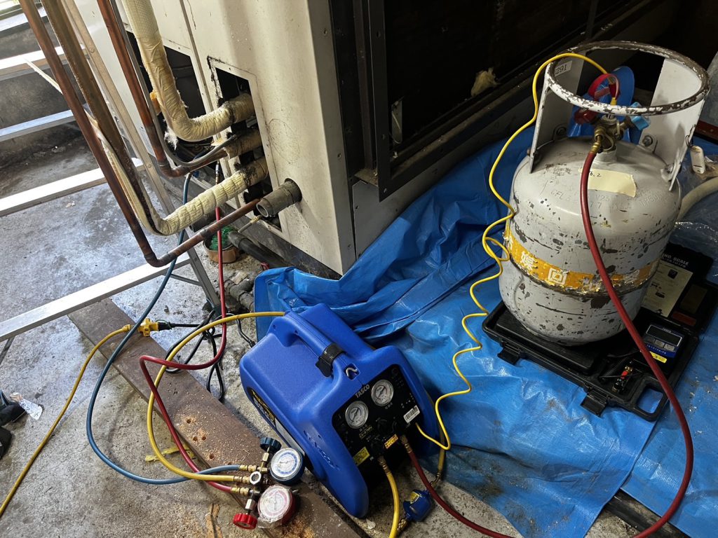 今回は京都市の工場様より、設備更新(入替)に伴う冷媒ガス回収のご依頼をいただきました。