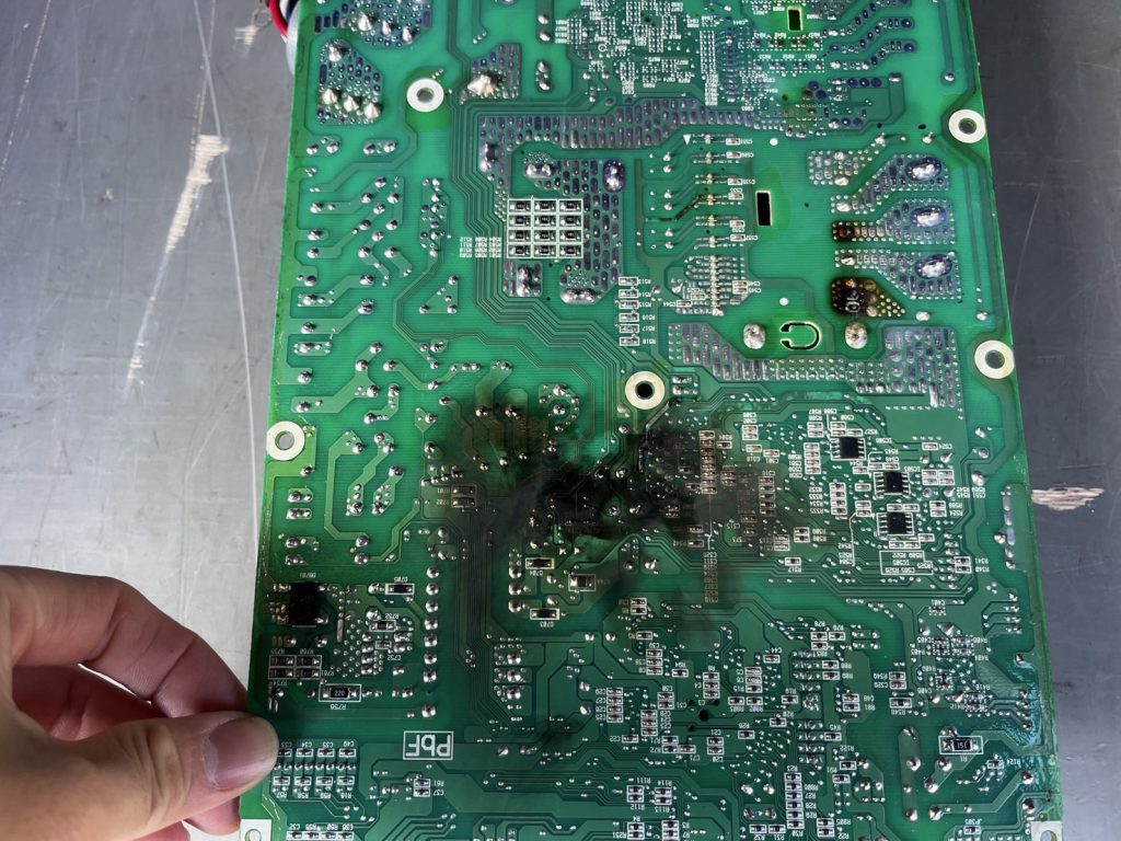 点検の結果、ファンモーターの不良により基板が焼損していることが判明。